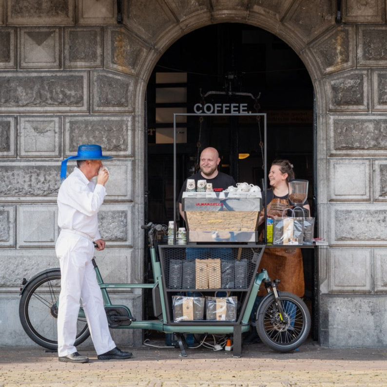 Wij nemen vrijwel alles zelf mee: van de espressomachine en koffiemolen tot bekers, bonen en melk. Idealiter is er een stroompunt (220V) in de buurt voor onze apparatuur. Geen stroom beschikbaar? Geen probleem – wij kunnen indien nodig werken met een accu of stille generator, zodat de koffie blijft stromen. Verder is een vlakke ondergrond van ca. 3x2 meter voldoende voor onze bakfiets en een paar statafels. Water voor de machine hebben we in jerrycans bij ons, dus daar hoef je niet voor te zorgen. We bouwen snel op en breken na afloop netjes weer af, zonder gedoe voor jou als organisator.